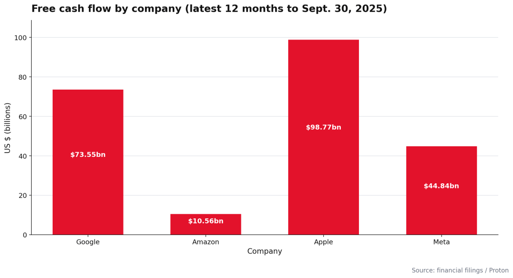 The chart above shows each company’s reported free cash flow for the most recent 12-month period, based on publicly available filings aggregated by Proton. Apple and Alphabet generate orders of magnitude more discretionary cash than Amazon and Meta.