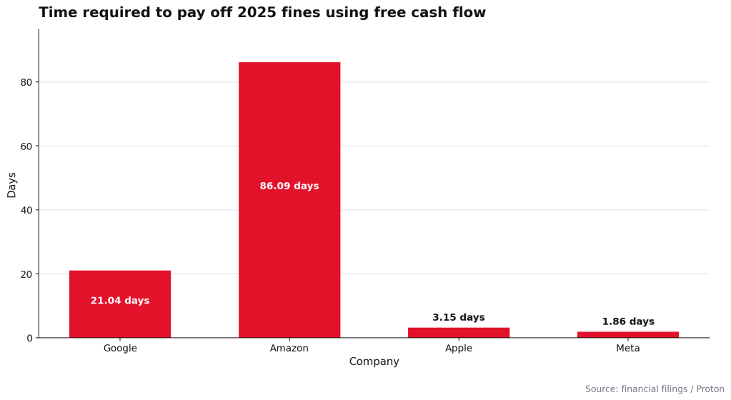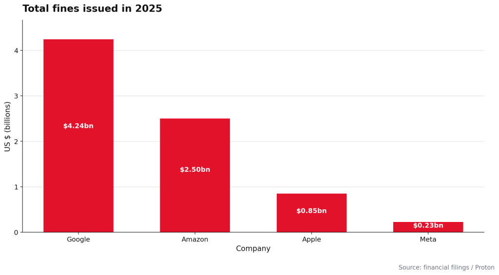 The broader implication is uncomfortable for regulators. Fines are rising and enforcement activity is persistent, yet the deterrent effect remains questionable. Since Proton began tracking these penalties in 2022, cumulative fines have exceeded $21 billion — still a rounding error relative to the cash these companies throw off annually.