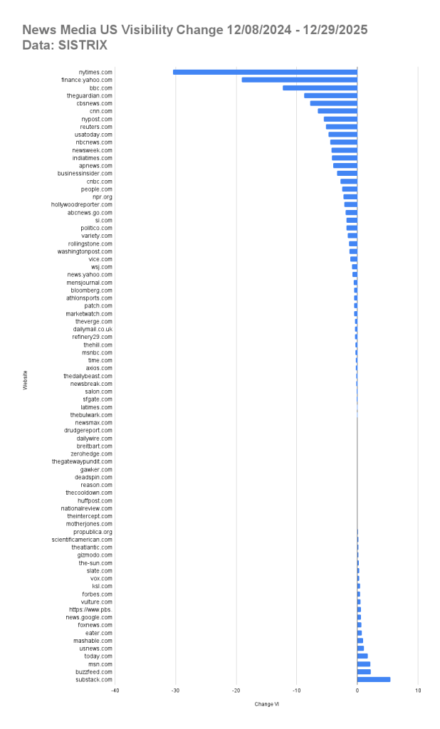 The most notable increases in search visibility scores – which measure how visible a site is in Google search results (and how well that site is ranking) – were at Mashable (36.8% change), Substack (30%), Vulture (29.4%), MSN.com (21.7%) and The Intercept (19.3%).