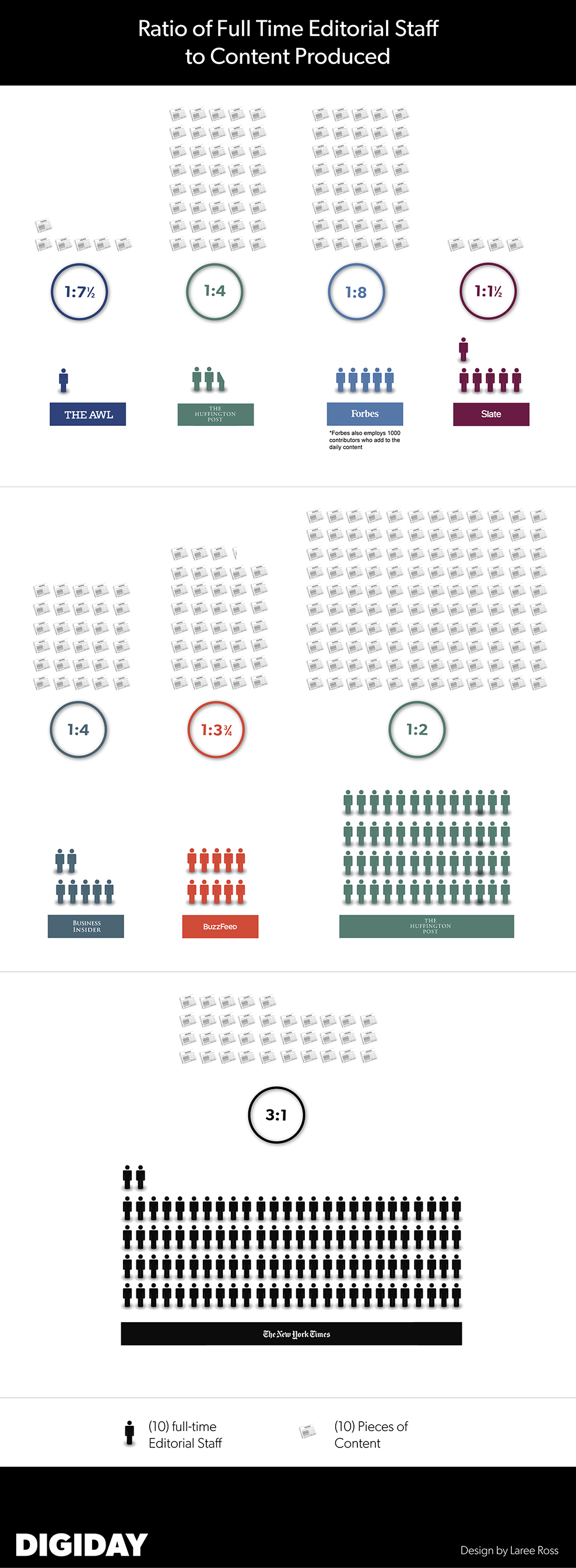 Digiday looked at several publications — from stalwarts like the New York Times and Forbes to upstarts like Buzzfeed and The Awl — to see how much content they pump out on a daily basis compared to the size of their full-time editorial staffs. Here are the numbers: